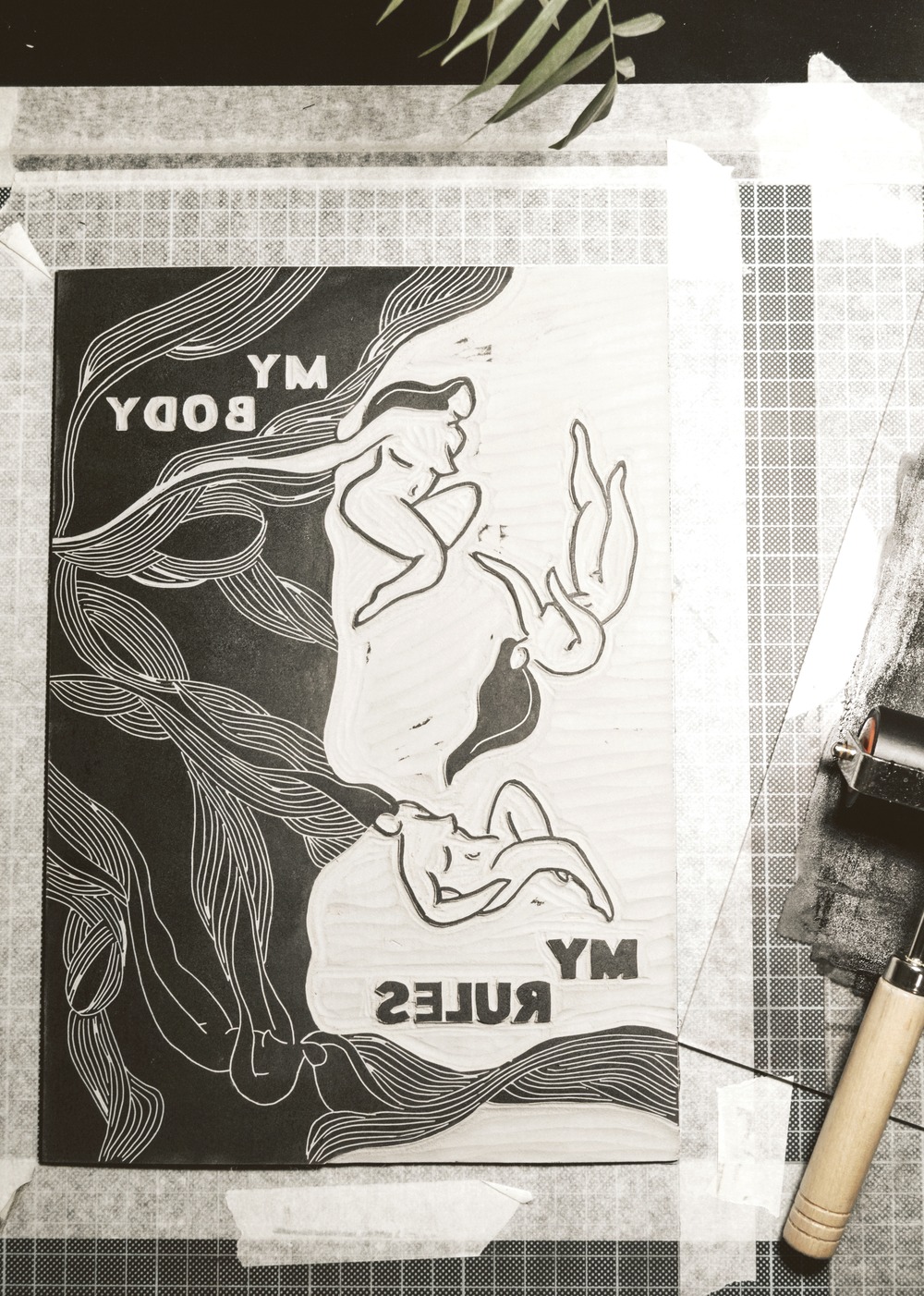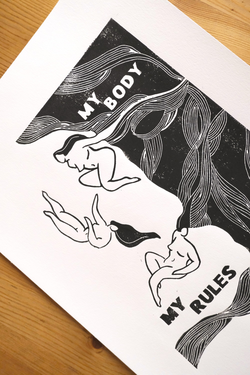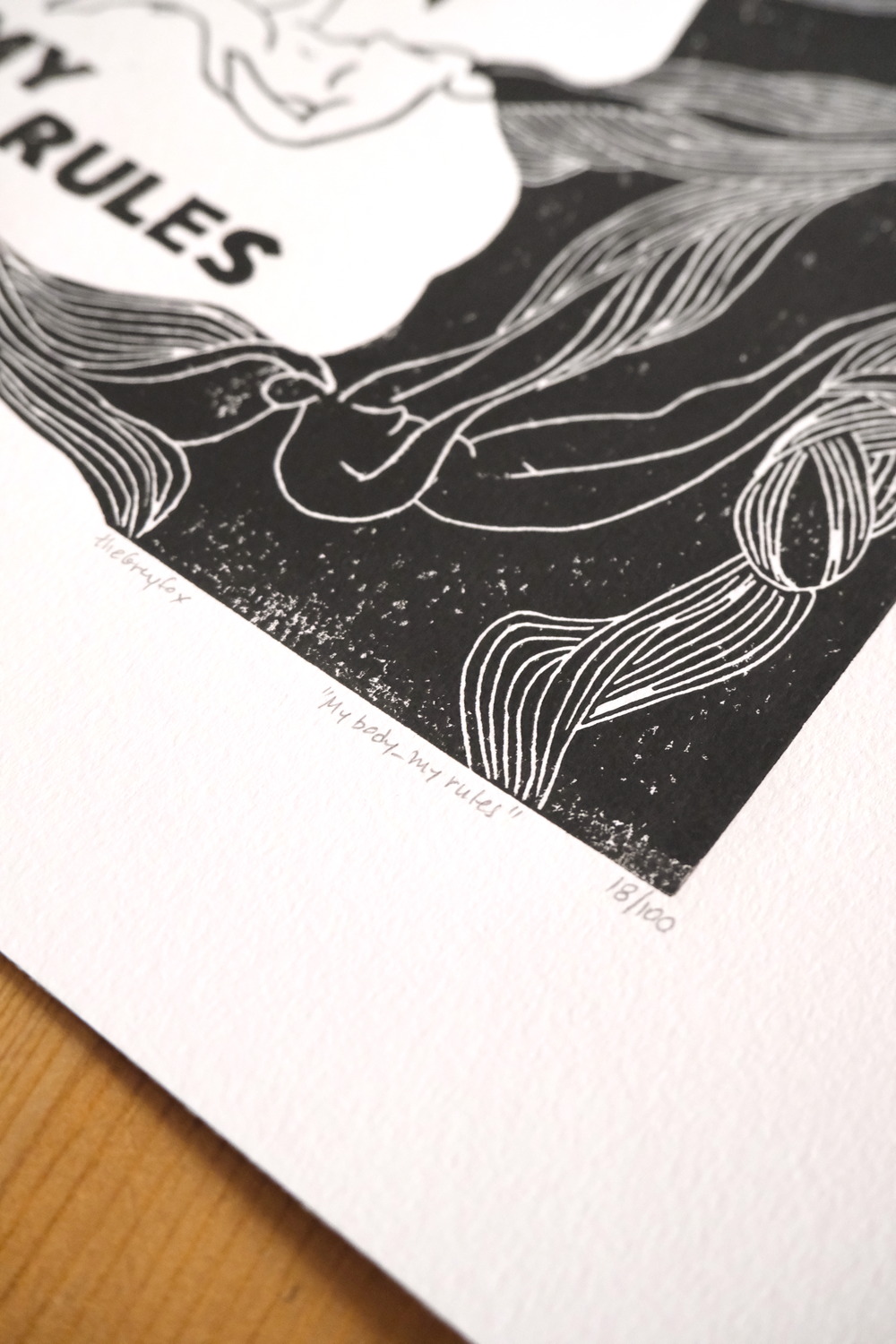 Due to the nature of printmaking, each linoprint is one of a kind so it may